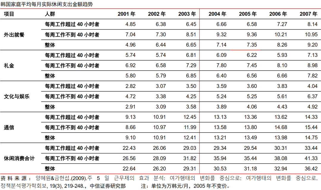 在“钱”方面,韩国的劳动分配率在20世纪90年代中后期下降,原本覆盖率和福利水平都很有限的社会保障体系在亚洲金融风暴期间也充分暴露出其漏洞,于是1998年金大中政府提出“生产性福利”改革方向,修法扩大社会救助的保障范围,至2000年已实现雇员“四大保险”的普及化,其社会保障改革减弱了家庭预防性储蓄动机,并有效促进了服务消费需求的扩张。在“闲”方面,韩国于本世纪初推行五天工作制,国民休闲消费支出随之逐年增加,不过由于加班仍很常见,缩短标准工时本身对服务消费的正向促进效果可能不够稳健。